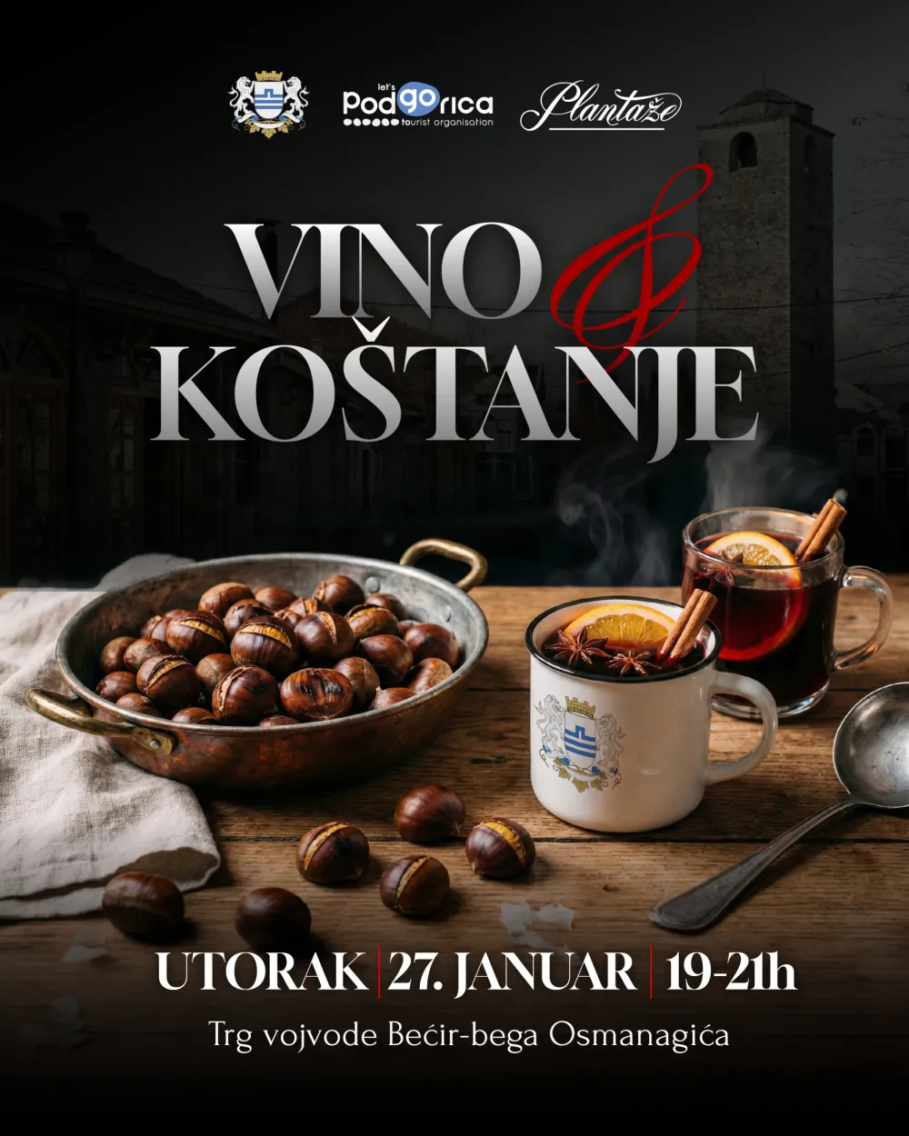 Tradicionalna manifestacija Turističke organizacije Podgorice "Veče vina i koštanja" biće organizovana u utorak, 27. januara, u 19 sati, na Trgu vojvode Bećir bega Osmanagića kod Sahat kule.