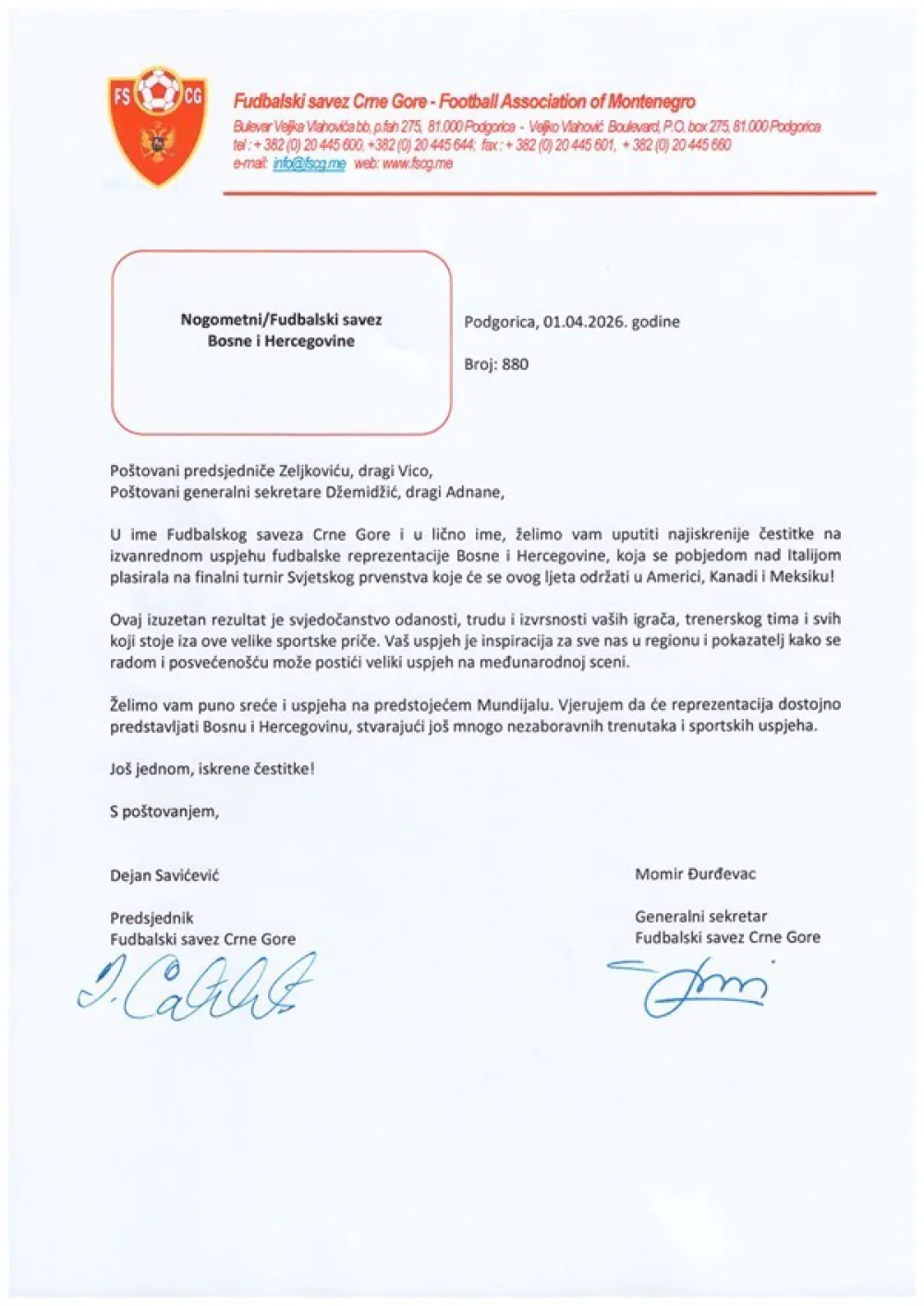 -U ime Fudbalskog saveza Crne Gore i u lično ime, želimo vam uputiti najiskrenije čestitke na izvanrednom uspjehu fudbalske reprezentacije Bosne i Hercegovine, koja se pobjedom nad Italijom plasirala na finalni turnir Svjetskog prvenstva koje će se ovog ljeta održati u Americi, Kanadi i Meksiku! Ovaj izuzetan rezultat je svjedočanstvo odanosti, trudu i izvrsnosti vaših igrača, trenerskog tima i svih koji stoje iza ove velike sportske priče. Vaš uspjeh je inspiracija za sve nas u regionu i pokazatelj kako se radom i posvećenošću može postići veliki uspjeh na međunarodnoj sceni. Želimo vam puno sreće i uspjeha na predstojećem Mundijalu. Vjerujem da će reprezentacija dostojno predstavljati Bosnu i Hercegovinu, stvarajući još mnogo nezaboravnih trenutaka i sportskih uspjeha. Još jednom, iskrene čestitke – stoji u pismu čelnih ljudi FSCG